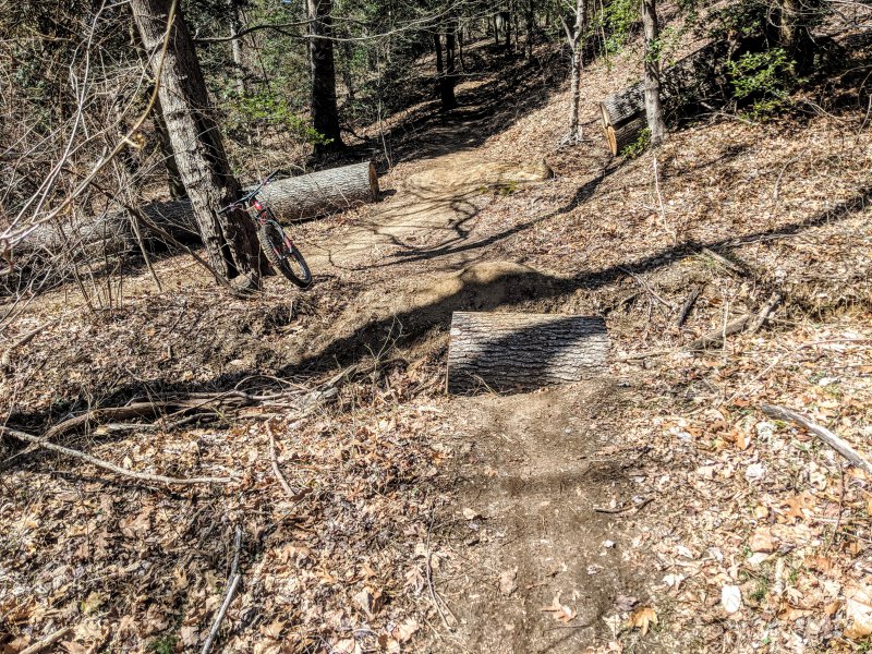 I don't know what I'm doing so I won't be hitting this anytime soon. I like my wheels planted on the ground.That's been there awhile. If you choose to hit this, I don't, the ramp will launch you over the log since it's higher then the log. It's in a dumb spot and off the trail so most people do not hit this and if you do then I hope you know what you'r doin...