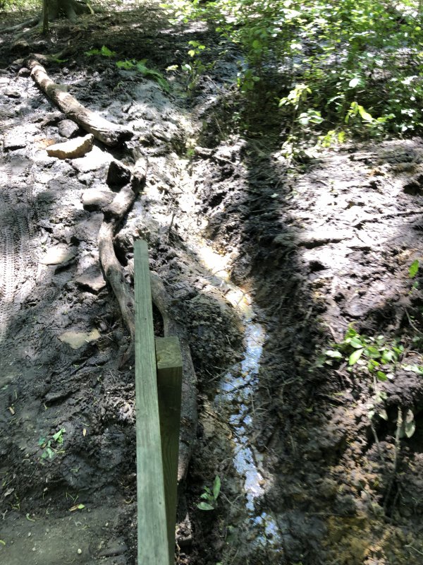 Those spots had dried out pretty well when I was there earlier this week, but have filled back up with the rain Thursday morning and overnight into Friday. Go-arounds have formed at a few of them where folks are detouring around the other side of the trees. There are also two offshoots from Many Log Run that the equestrians have formed. [Plus, I noticed that somebody pulled out two of the old water bars... not that they were effective anyway.]