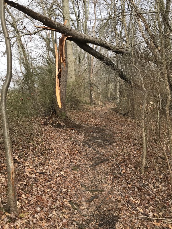 Mick & I got out this morning and removed the downed tree reported by Big Al on the Red trail loop adjacent to East Picnic. We also cleared two trees in the "Gonna Fall Soon" class on the way out. We have noticed that the last three trees we felled were pretty much sawdust, completely rotted thru. Only a matter of time (usually the most inconvenient) until they drop.