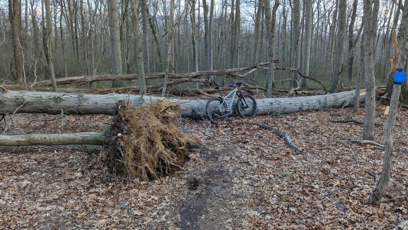 Yesterday I cleared the smaller stuff and overhangs from the power line right of way back towards south post road. All the trees in Al's post above have been cleared. We still have to clear some bigger trees near the power line right of way. That section got hit really hard by the tornado. Multiple trees laid flat and root balls out of the ground leaving big holes in the trail bed. Looks like a bomb went off!