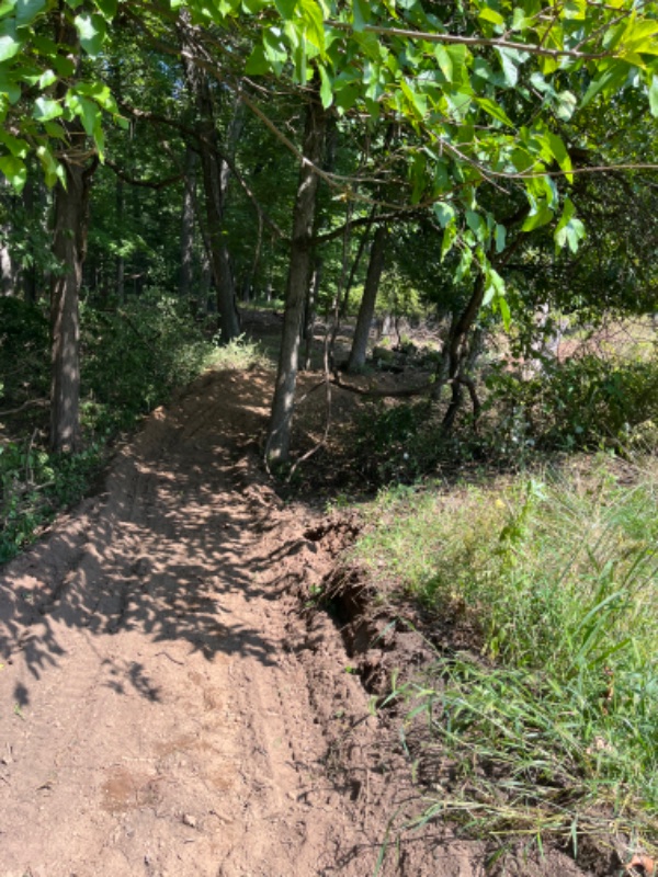 I then moved down the trail and blew out the rubble from the pavement crossing to the log-drop-ish thing. The first berm after the pavement is...better. Won't lie, this is not good. But it's better. The dirt here is garbage so we're going to source dirt from elsewhere and build this up better. It also needs to be weed whacked but I forgot to bring it with me today.