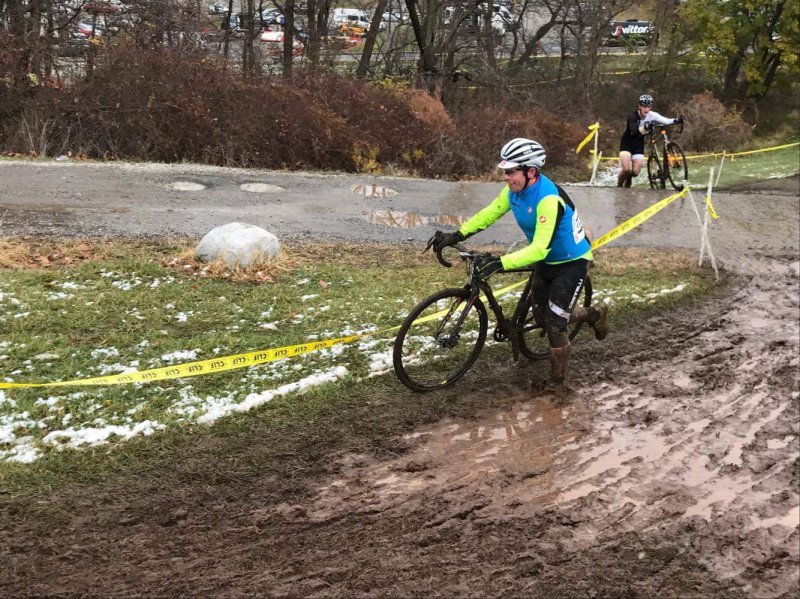 One lap course recon. Holy fuck. Sit in the car for an hour. Watch a little of the 4/5's. Yell at @1sh0t1b33r , Jeff, and a few others. Back in the car for an hour. Watch Harry & Sean again in their race. Go to car, change socks, cover shoes with duct tape (yes, it did help, so fuck off 🙂), change gloves, ditch skull cap and jacket, and make it to staging as call ups start. Same staging. 4th row. Go! Up the pavement to the first off camber along the fence. I find myself on the high line, make up a few lost spots along the way until the end when I catch my bar on the chain link fence. Stay upright, but loose a few spots. Then we hit the off camber turns, and the right hander is all jammed up. Running, remount, hot that long off camber straight by the tennis court, try to ride, and slide out. The mud is just nasty. As we hit firmer ground, I notice my chain dropped. ugh. 3rd time this year? fix, remount, still not DFL, how is that possible? I see @jShort but the corner of the building and say hi as I ride by. I managed to make a few passes up on the flatland by the barriers. A few before, and a few after. This was a battle to stay upright the entire race, Even while running up the mud hills.