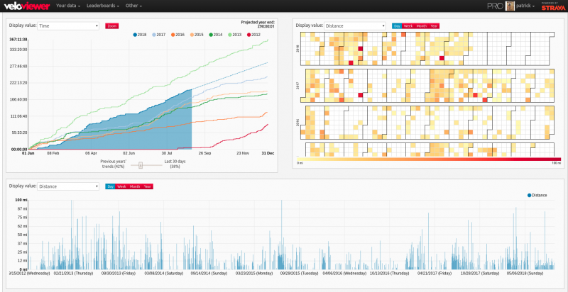 On Veloviewer - I like the density of the data on a single page. Here is my summary - graph on the left if cumulative time exercising. Calendar is color coded