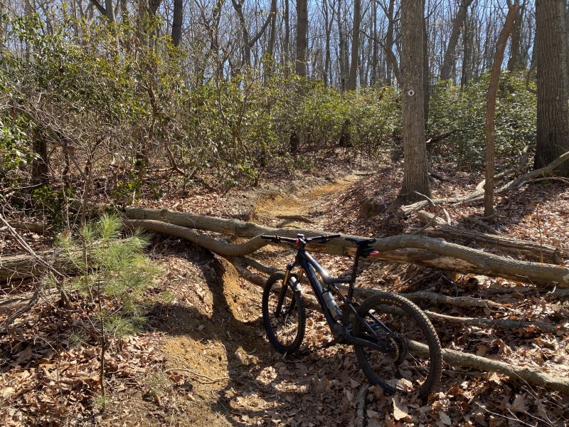 This fallen tree is still there. At the bottom of what can be a very fast downhill section.This in Huber at the bottom of Many Log Run. Don't come bombing around the corner!