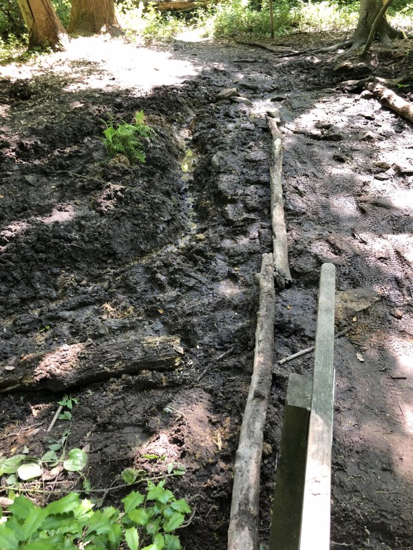 Those spots had dried out pretty well when I was there earlier this week, but have filled back up with the rain Thursday morning and overnight into Friday. Go-arounds have formed at a few of them where folks are detouring around the other side of the trees. There are also two offshoots from Many Log Run that the equestrians have formed. [Plus, I noticed that somebody pulled out two of the old water bars... not that they were effective anyway.]