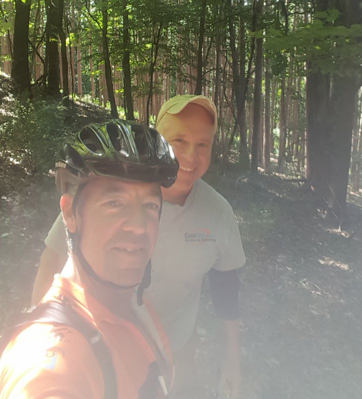 We finish up the roller coasters on yellow and come through the start finish together. At this point I know I am in trouble when my best effort could not shake Jamie. Our lap time was 29 minutes, so we made the sub 30 club but there is no way I can keep that pace.