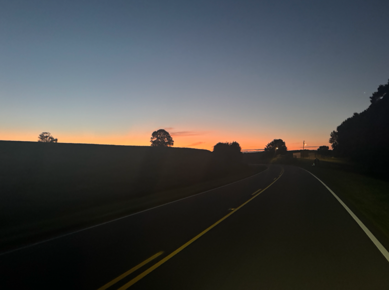 I see some eyes glowing in front of me and with the rolling roads, unsure if it's up farther ahead and a deer, or right in front of me and a racoon. As I get closer, I realize it's some crackhead dude walking in the street smoking a cigarette and scares the shit out of me, thankfully I hit him with a good morning and he was just as excited to see me. The sun comes up and the garmin switches from dark to night mode, phase 1 complete.