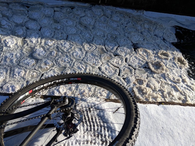Cool looking ice rosets in the locksPlan was to do the path to 6mr, but no takers so I stayed on the path and tried to make it to Trenton. Came out short, somewhere between Princeton and Trenton. About 4 degrees at the start but it felt colder riding into the wind on the way back. I hate riding the canal path and was terribly bored most of the time. Took the SS, so was able to use my thick down mittens, though too much fill on the palm. Fingers stayed warm the whole ride, but toes were cold all day. I'll need to get artificial heat next time it's this cold. I wore my thickest winter socks and Sorels but still not enough after 30 mins.