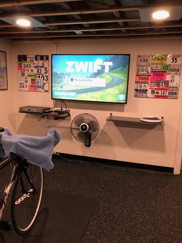 So finally a follow-up on this. Our basement remodel/ bathroom build was completed back in November, and I had my indoor cycling area set up not too long after that, but it took another couple of weeks to get the shelves (had to order them and there was a delay in delivery) and then a little longer to get the flooring installed (it's rubber gym flooring throughout the finished basement area now, replacing a ratty old berber carpet.) Then finally, my photos were finished just last night. Those are two shots I took out in Colorado this past September. My local camera store converted them to canvas for me. I'm thinking I'm going to get a few more, but I'll probably wait a bit until I have some shots from different areas. I still have a couple small things to do yet. The green wires need to be hidden- they're for my air compressor in the shop area on the other side of the TV wall. And I need to install a Wi-Fi network specific to this area because I keep losing my connection to the Zwift companion app, which makes me seem like a total dick because I can never easily give Ride-Ons, LOL. Anyway, really enjoying the new setup. Overall, I now have my indoor riding area, a TV, a full bathroom, a wardrobe, a bike shop area complete with a utility sink, and a beer fridge. I'm running out of reasons to spend any time upstairs ...