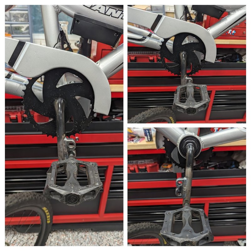 Old school, 1 piece CroMo bmx cranks have a lot of downsides, but they also have one good thing going for them: weldability. With some spare 1/2" stock, i cut, drilled and shaped a pedal mounting boss to weld to the crank arms. With the cranks being 140mm native, i whipped up these with spacing that would go as low as the Woom 80mm and an in-between 110mm (all 30mm apart). The thought is that we can start on the shortest setting and progress through, that is if we still have any interest (you know kids...). I even opted to attach them on the leading face of the crank arms to better handle the massive watts a wee child generates on the power stroke.