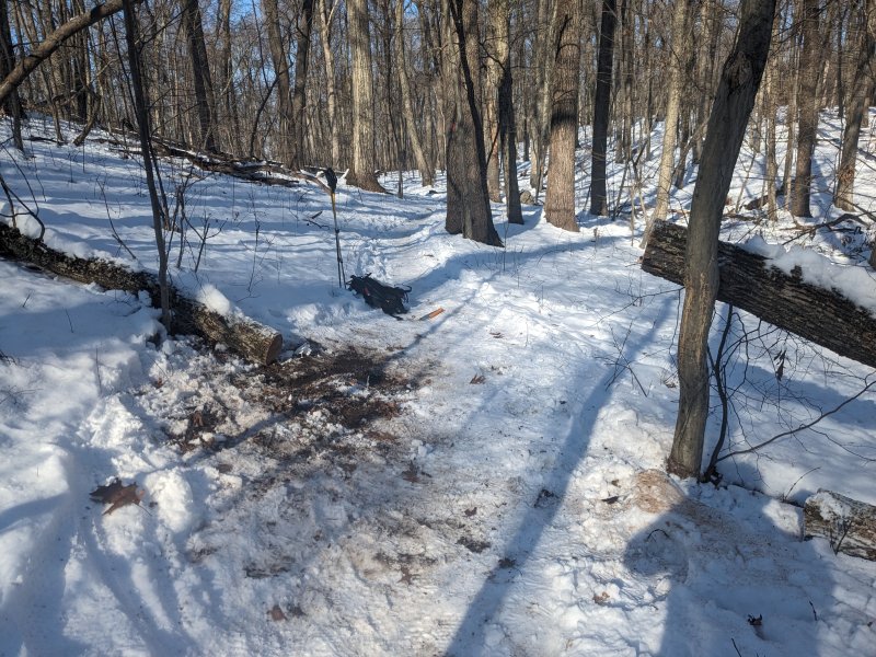Thanks for the cut! I thought that one needed a chainsaw.I happened upon this tree while snowshoeing/hiking today. I had my trusty Silky "big boy" saw handy, so it's been deleted. The trails are in great shape for biking, save for a few icy spots. I almost went home to reconfigure for biking!! Fat bikes and skinny bikes alike were all out today. Kudos to the trail maintainer who drags a sled around to groom the snow.