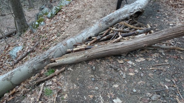 As someone who has a pretty practical bunny hop in my bag of tricks I can say one of my biggest pet peeves is coming to a small logover and having to deal with a bunch of small broken sticks laying all over the trail on both sides of the log at a time when I would really want clean trail on both sides. This is a prime example of totally unnecessary and, in my opinion, detrimental stick piling as this log can pretty much be rolled with minimal skill.