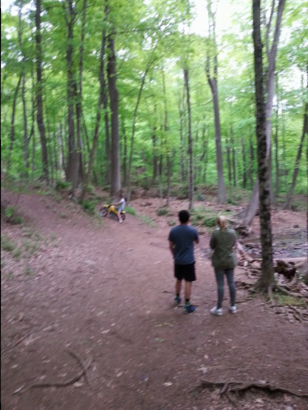 I was going to yell at the kid but when I looked at him he looked like a stupid dog...besides that scooter was so underpowered with his large body Woody and I could walk faster through the woods then he could ride that kick and go. We just laughed. It kinda reminded me of myself back in the day of unsupervised entertainment.Not the first time...But no helmet...idiot.